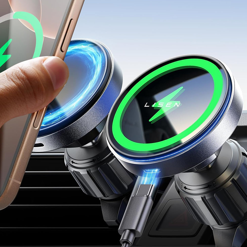Die Halterung bietet beschleunigtes kabelloses Laden bis zu 15W, geeignet für die meisten modernen Qi-kompatiblen Smartphones.
