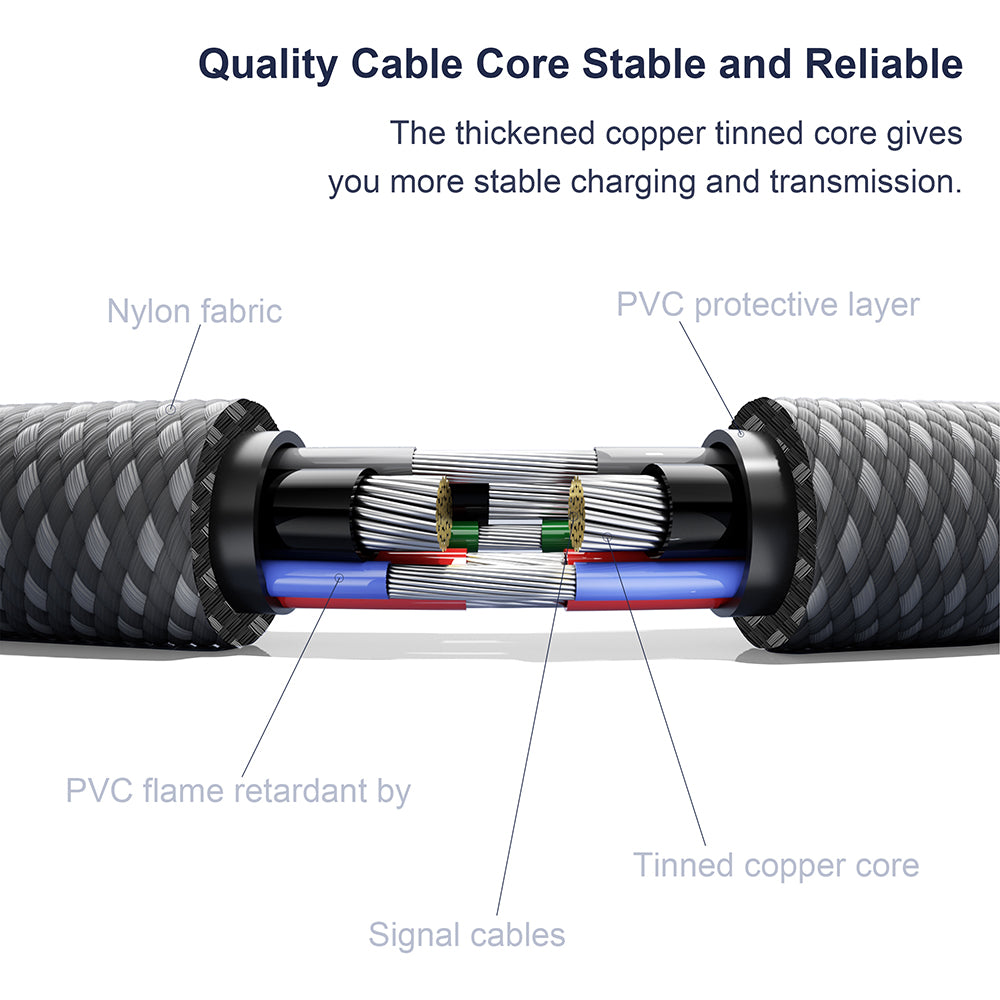 Die robuste Konstruktion mit geflochtenem Nylonäußeren und Metallkern bietet außergewöhnliche Haltbarkeit und ein elegantes Finish.