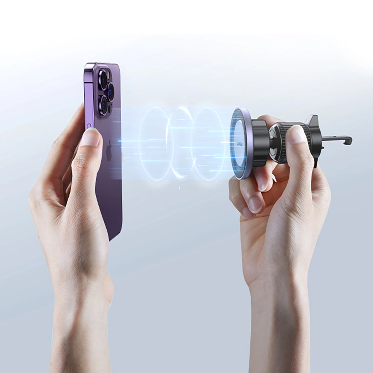 direkt am Lüftungsgitter des Autos bietet. Ausgestattet mit starken Magneten, hält diese Halterung das Telefon fest in Position, selbst wenn