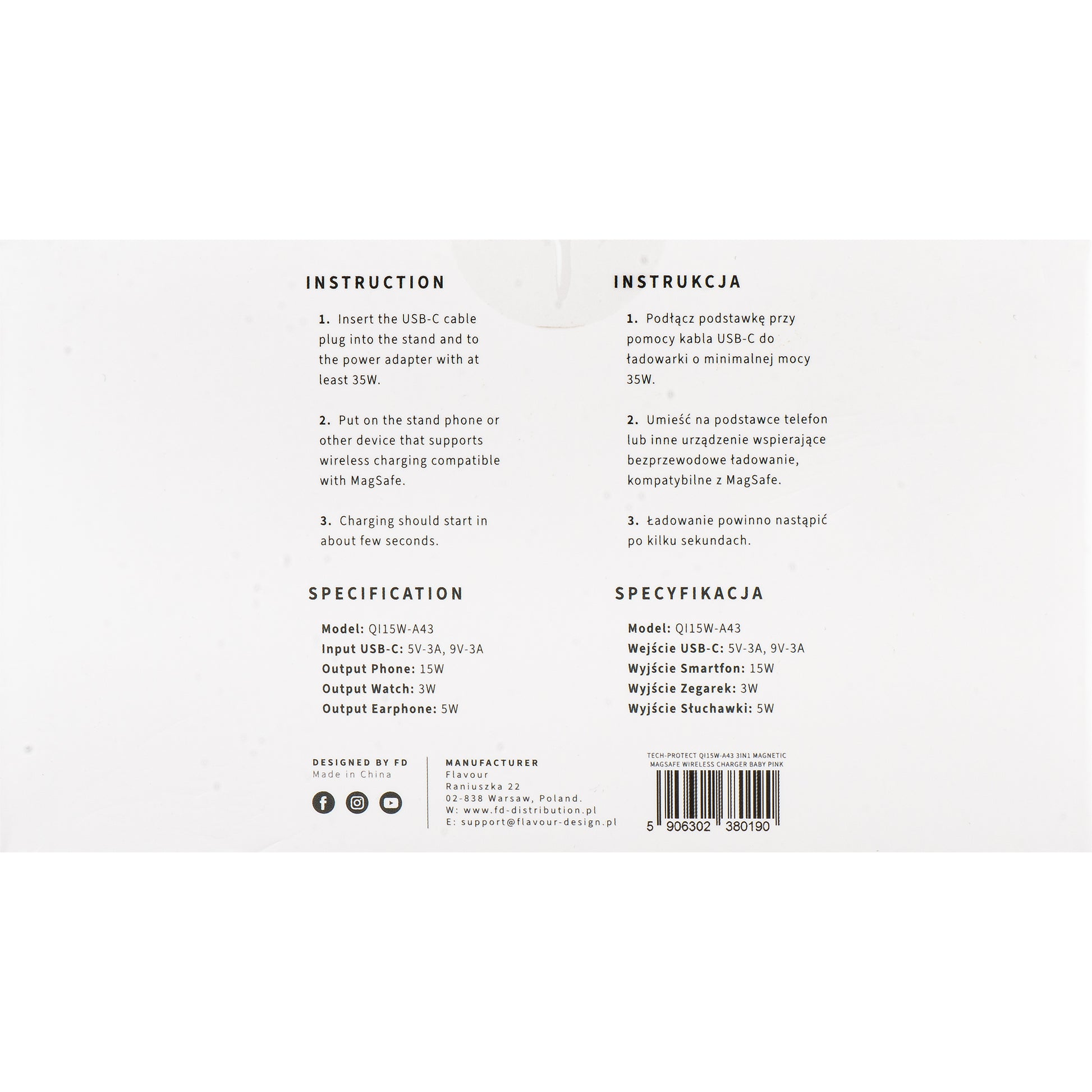 Wireless Network Charger Tech-Protect QI15W-A43 3in1 - Pink Tech-Protect QI15W-A43 is an innovative network charger, compatible with MagSafe technology, offering you convenient and stable charging for all your devices. Thanks to the integrated MagSafe support, you can quickly and safely mount your smartphone, ensuring an ideal charging position. Supports fast wireless charging of 15W for phones, 5W for headphones, and 3W for smartwatches, allowing you to charge multiple devices simultaneously. It is also compatible with universal charging standards such as AFC, PD, QC2.0, QC3.0, and FCP, ensuring compatibility with the latest technologies. Cutting-edge technology ensures fast, safe, and efficient charging, and the elegant and compact design of the charger will perfectly integrate into any room. Subtle LED lighting adds a modern touch, and the low energy consumption in standby mode is an additional advantage. The included 1-meter USB-C cable facilitates comfortable use. *The MagSafe function works only directly on the phone or on a case compatible with MagSafe. **To benefit from the full capacity of the inductive charger, we recommend connecting it to a network charger with an output of at least 35W. Features: - USB-C input current: 5V/3A, 9V/3A - Output for smartphone: 15W - Output for smartwatch: 3W - Output for headphones: 5W - Modular design - Power supply function for three devices simultaneously - Power supply function for each device separately - Robust magnetic mounting Package contents: - 1 x Tech-Protect QI15W-A43 3in1 Wireless Network Charger - 1 x 100cm USB-C / USB-C cable