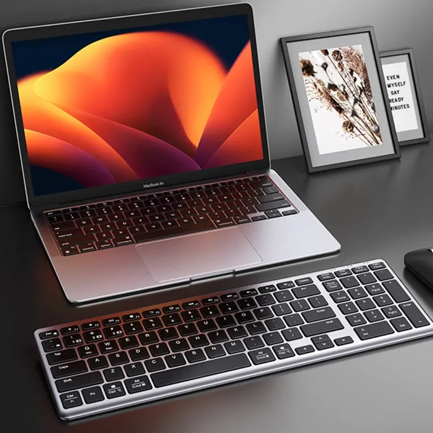 Made from premium materials such as aluminum alloy and PVC, the keyboard combines durability with an elegant and compact design. Equipped with a rechargeable
