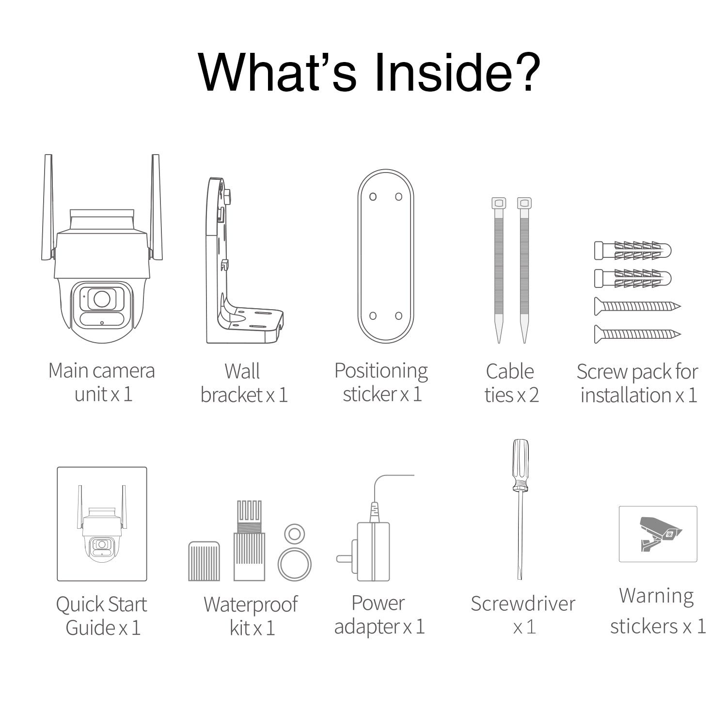 | Contenu | Accessoires de montage / Câble d'alimentation / Caméra de Surveillance / Chargeur Réseau |