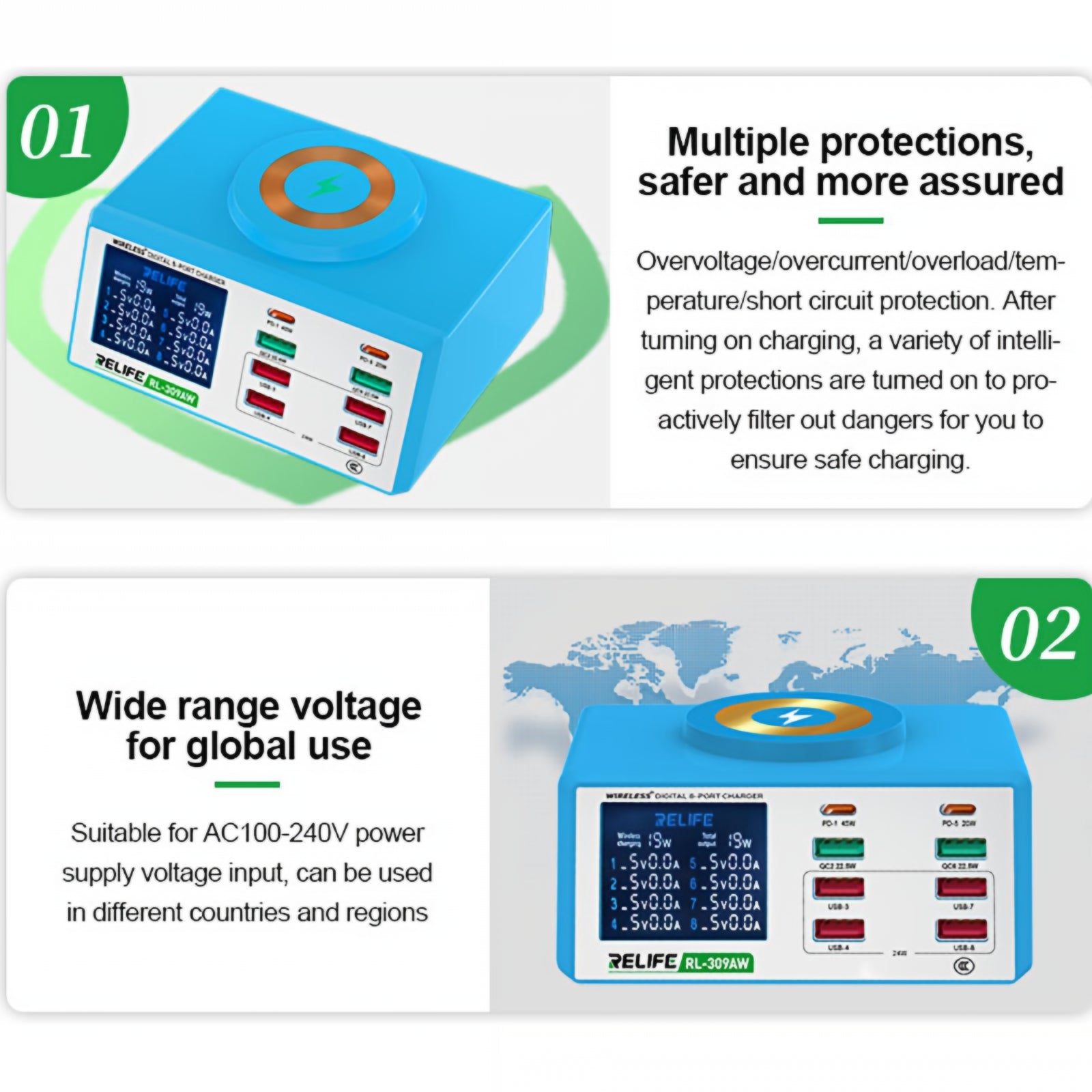 La station de charge Relife RL-309AW est conçue pour vous si vous utilisez plusieurs appareils et souhaitez une charge rapide, sûre et organisée, à la maison ou au bureau.