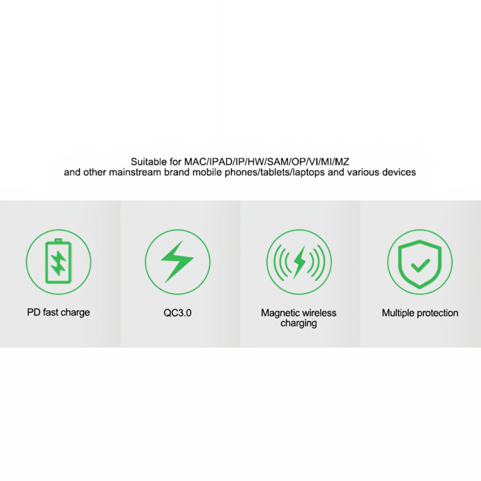 Vous pouvez charger simultanément des téléphones, des tablettes et des ordinateurs portables de marques populaires telles qu'Apple, Samsung, Huawei, Xiaomi et bien d'autres.