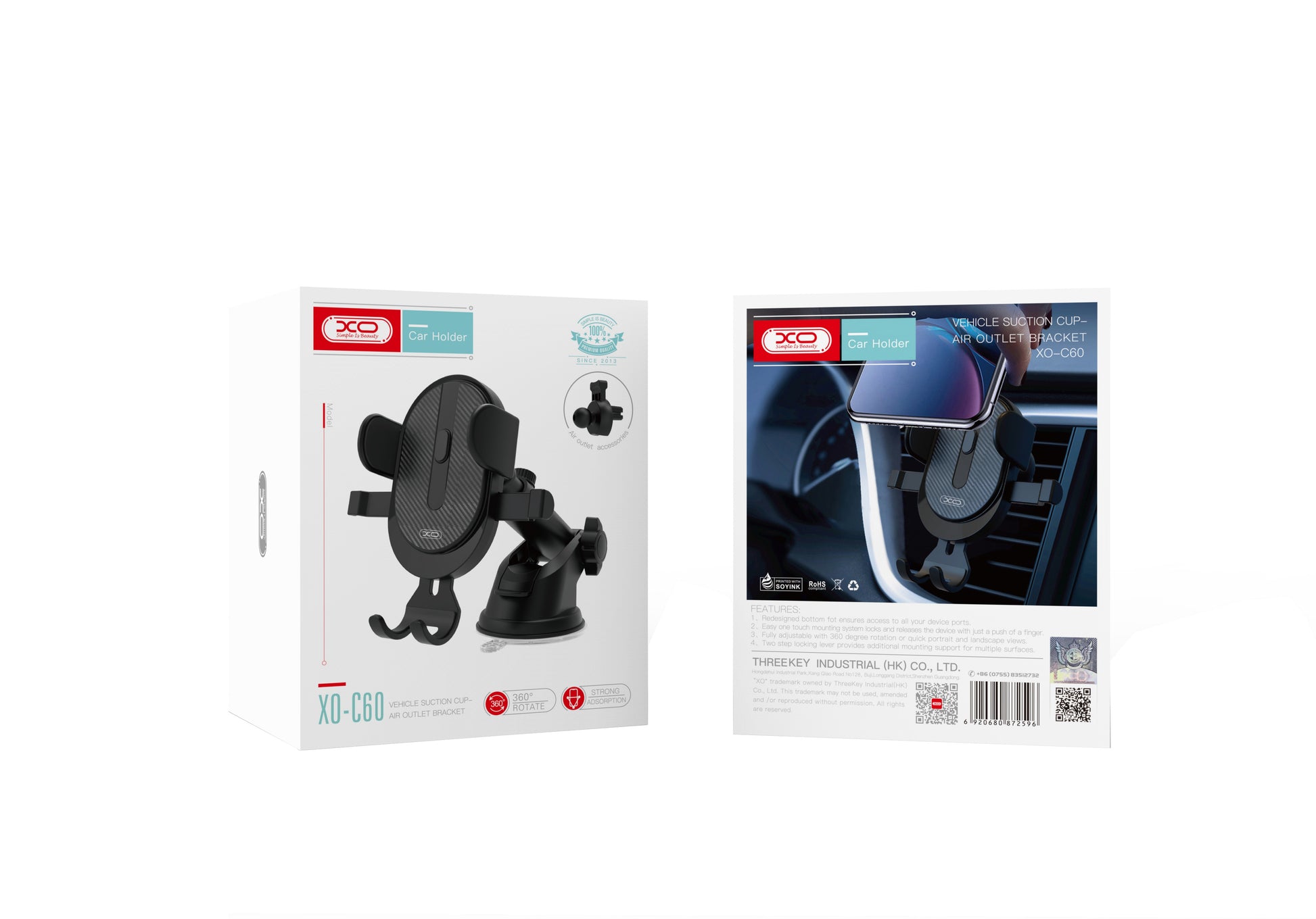 Le support XO Design C60 est un modèle 2en1 polyvalent, qui peut être monté aussi bien sur la grille de ventilation que sur le pare-brise ou le tableau de bord grâce à la ventouse incluse.