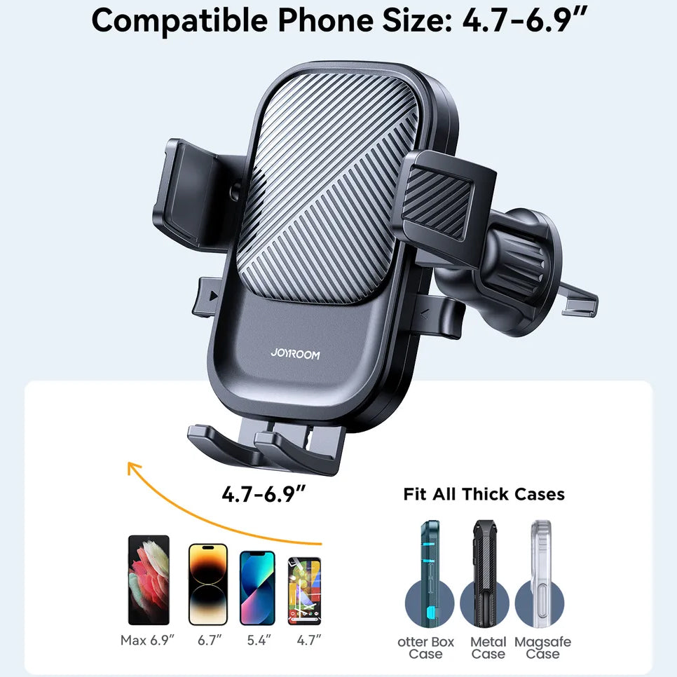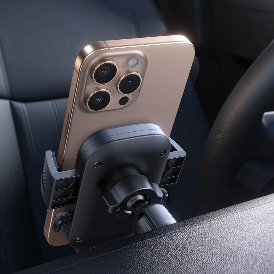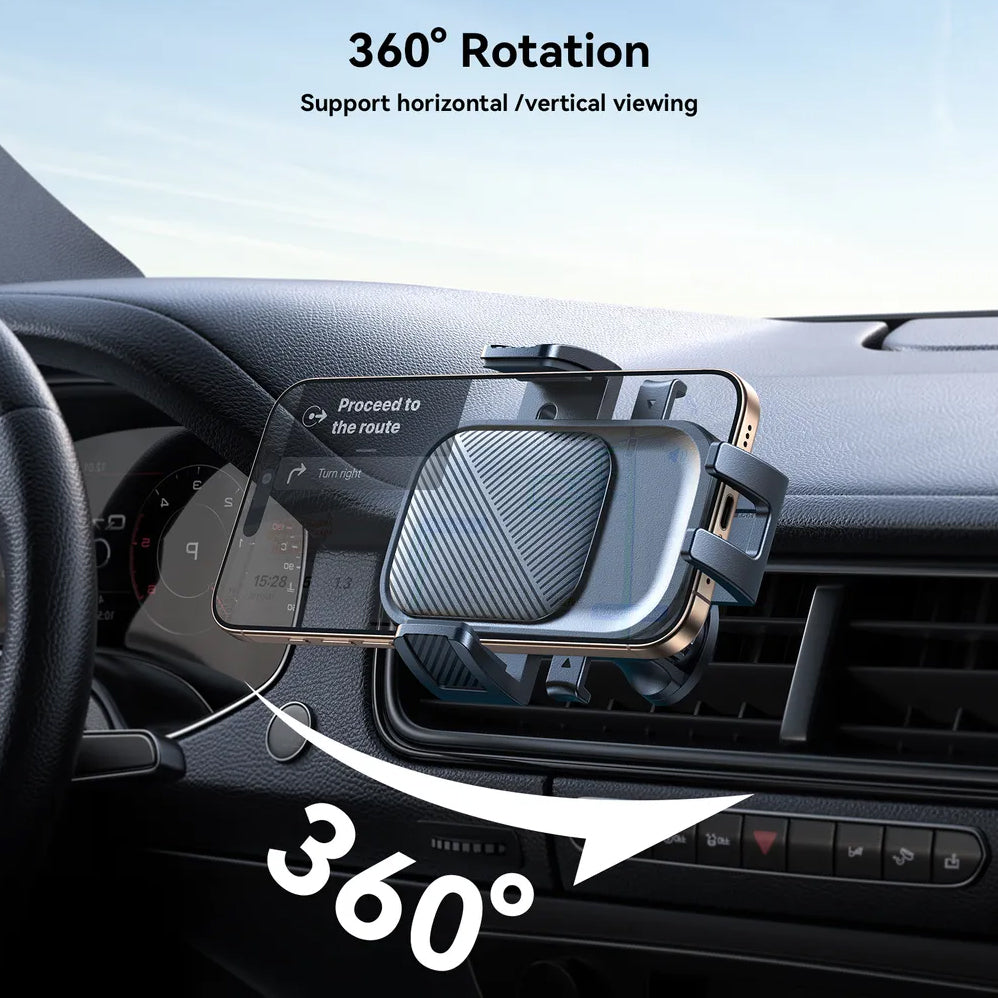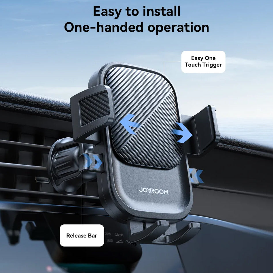 Ontworpen om te worden gemonteerd op het ventilatierooster, biedt de houder een stabiele en veilige bevestiging, zelfs op oneffen wegen. De brede armen en het robuuste bevestigingssysteem houden de telefoon stevig op zijn plaats, terwijl het ergonomische ontwerp bediening met één hand mogelijk maakt - je kunt de telefoon snel vastzetten of losmaken zonder je aandacht van de weg af te leiden.