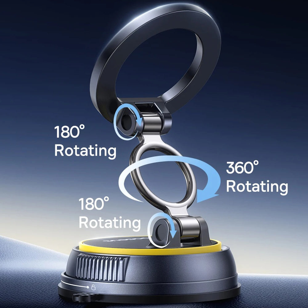 Voor ondersteuning gebruikt de houder een vacuümbasis en een draaivergrendelingsmechanisme. Dit houdt de houder stevig op het dashboard, zonder te glijden.