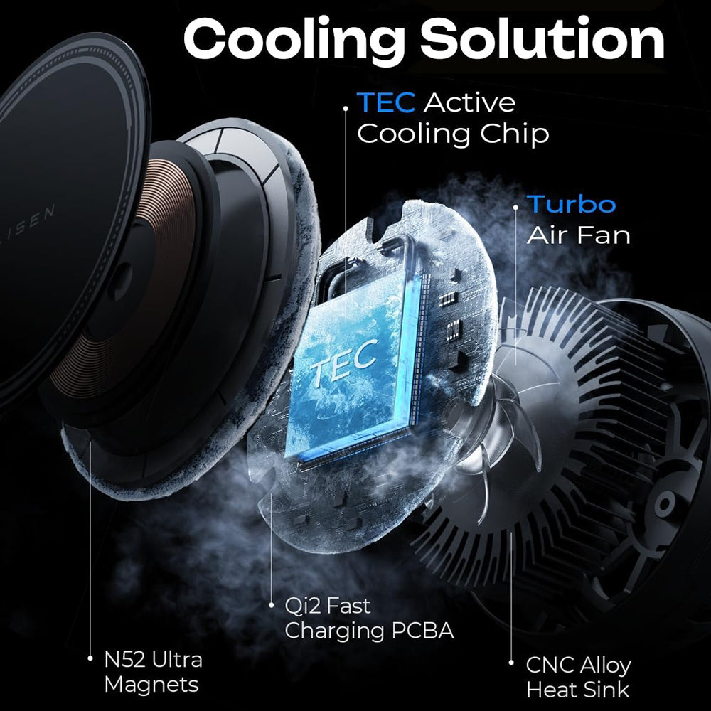 Het actieve koelsysteem houdt de optimale temperatuur van de telefoon tijdens het Qi2 opladen, effectief de gegenereerde warmte afvoerend. Het is tijd om te reizen met de Lisen passagier!