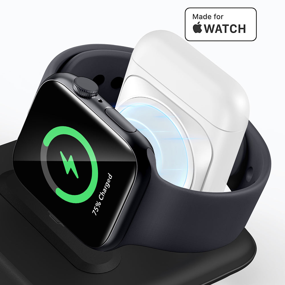 Het 3-in-1 oplaadstation is de onmisbare reispartner en niet alleen dat. Dankzij het compacte en ingenieuze ontwerp is het gemakkelijk overal ter wereld mee te nemen.