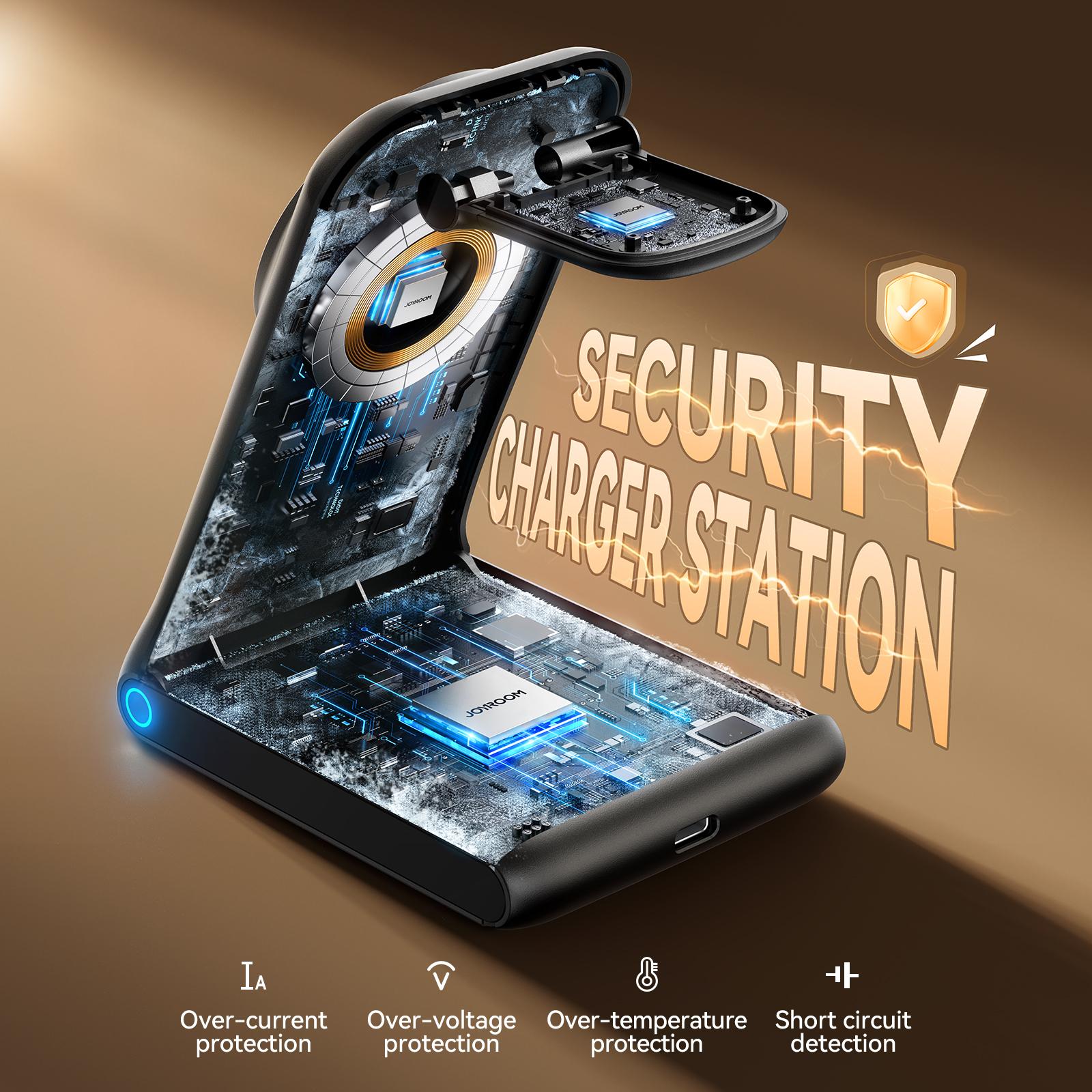 Raak verlost van verwarde kabels en geniet van draadloos opladen met Joyroom JR-W15, een ideaal 3-in-1 station voor op kantoor of thuis.